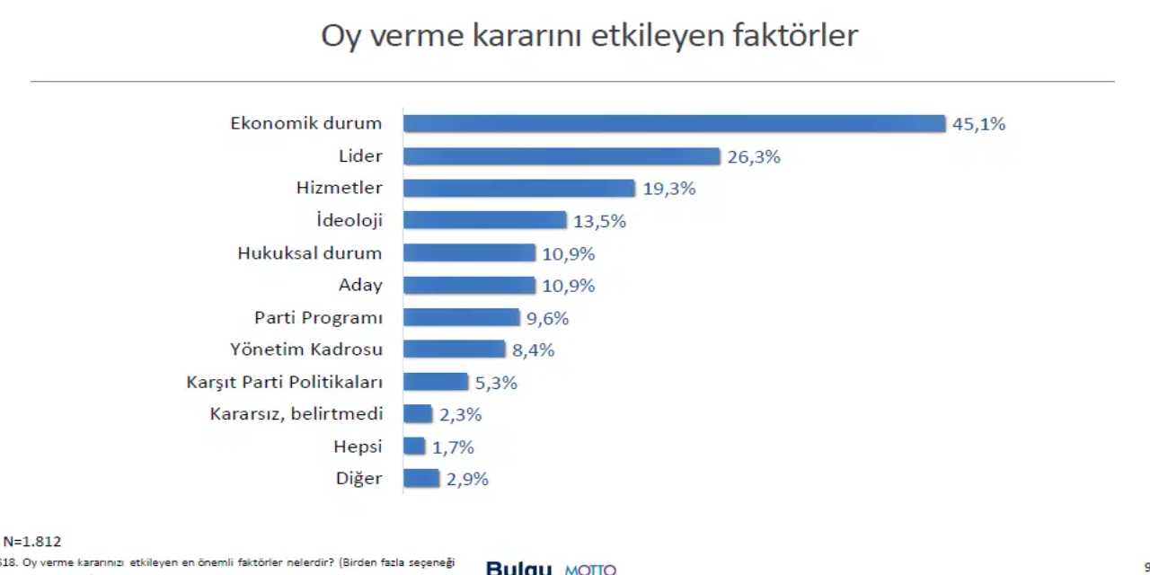 Vatandaşların oy verme kararını etkileyen faktörlere yönelik sorulan soru, halkın asıl gündemine ayna tuttu. Katılımcıların yüzde 45,1’i, “Ekonomik durumun” oy verme kararını etkilediğini ifade etti.