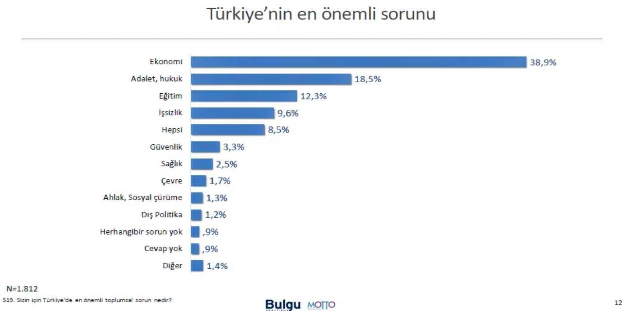 Katılımcıların yüzde 38,9’u, Türkiye’nin en önemli sorunun “Ekonomi” olduğunun altını çizdi. Yüzde 18,5’lik kesim “adalet ve hukuk” olduğunu söylerken, vatandaşların yüzde 12,3’ü “eğitim”, yüzde 9,6’sı işsizlik sorununa dikkat çekti.