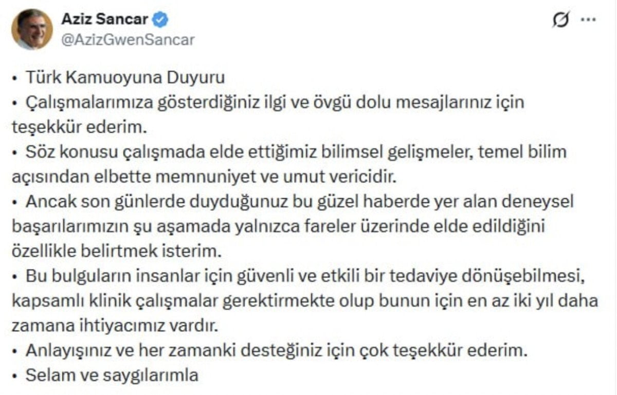 Türk bilim insanı Prof. Dr. Aziz Sancar, klinik deneyler için en az iki yıl daha zamana ihtiyaç olduğunu belirtirken, elde edilen başarıların şu an sadece fareler üzerinde gerçekleştiğini ve insanlar için tedaviye dönüşebilmesi için kapsamlı klinik çalışmaların gerekliliğine dikkat çekti.