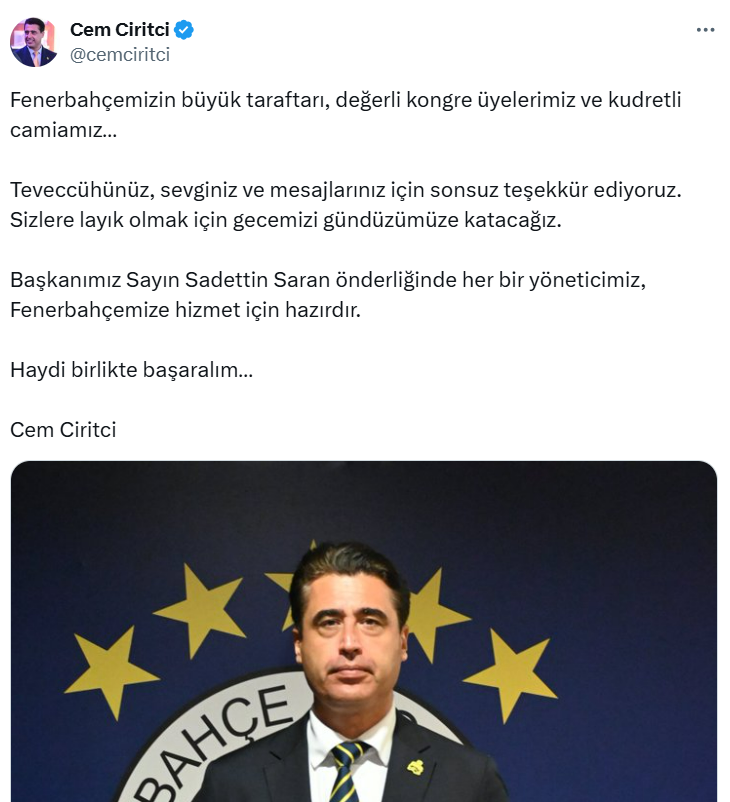 Gelişmeyi X hesabından duyuran Cirtici, “Fenerbahçemizin büyük taraftarı, değerli kongre üyelerimiz ve kudretli camiamız… Teveccühünüz, sevginiz ve mesajlarınız için sonsuz teşekkür ediyoruz. Sizlere layık olmak için gecemizi gündüzümüze katacağız. Başkanımız Sayın Sadettin Saran önderliğinde her bir yöneticimiz, Fenerbahçemize hizmet için hazırdır. Haydi birlikte başaralım…” dedi.
