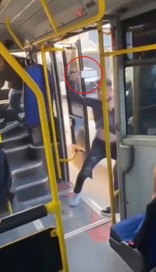 Durakta inen yolcu, açık olan kapıdan tutunma borusuna tutunarak tekme atmaya çalışırken, diğer yolcu ise ona yumruk attı.