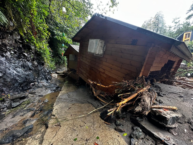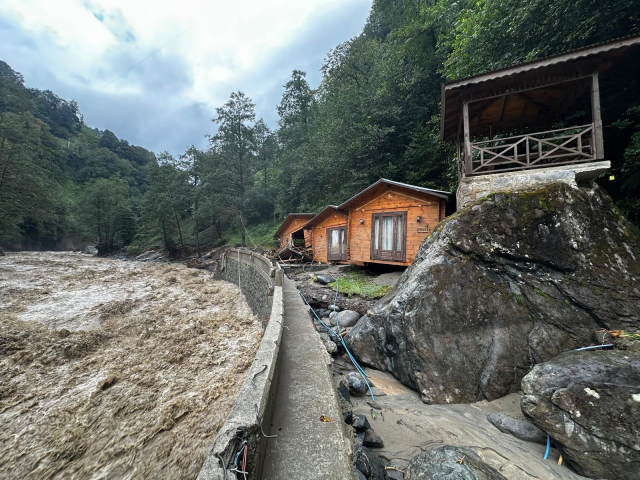 Çamlıhemşin ilçesinde etkili olan sağanak yağışın ardından dereler taştı. İlçede dere kenarında bulunan iki bungalov, şiddetli sel sularına dayanamayarak yıkıldı.